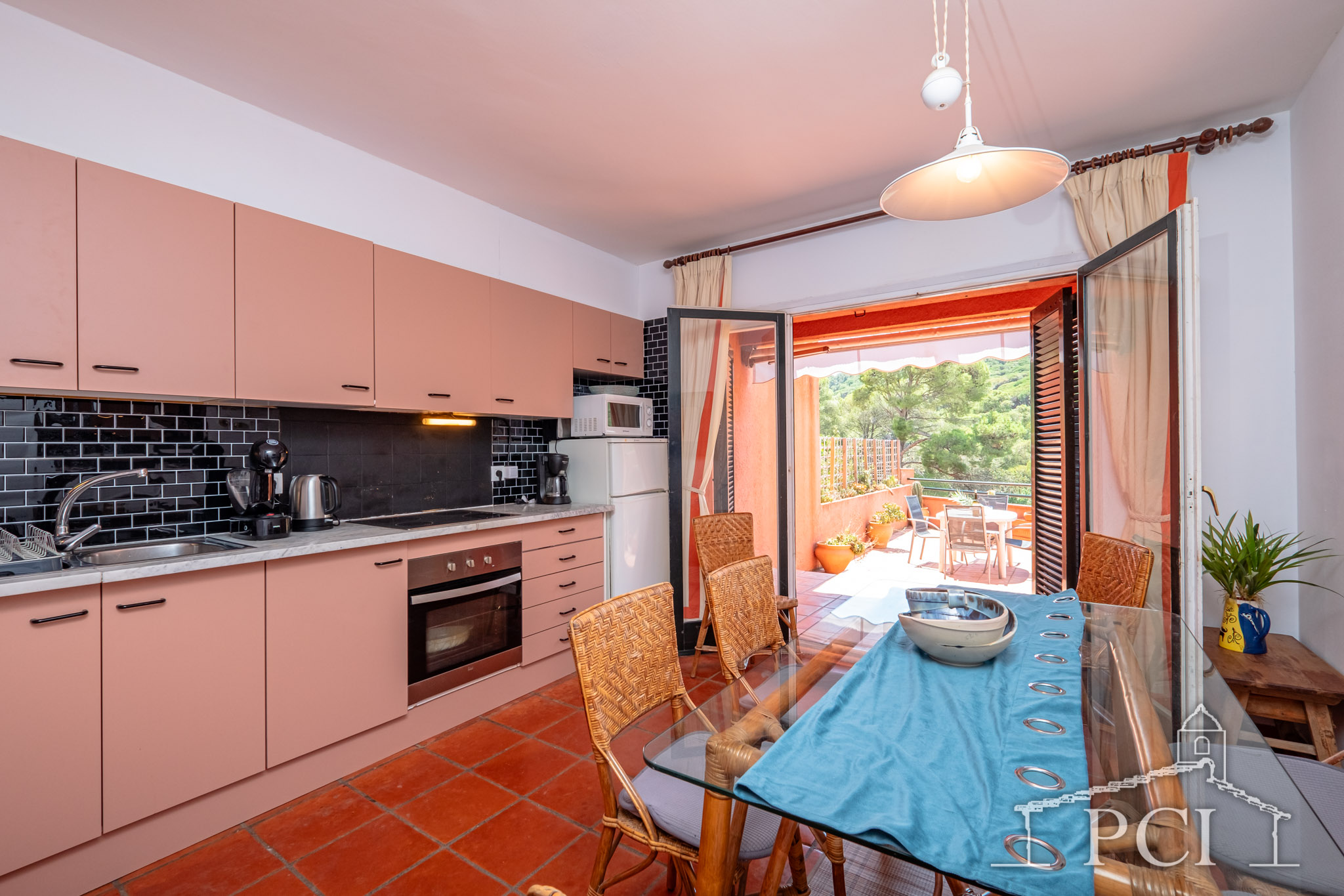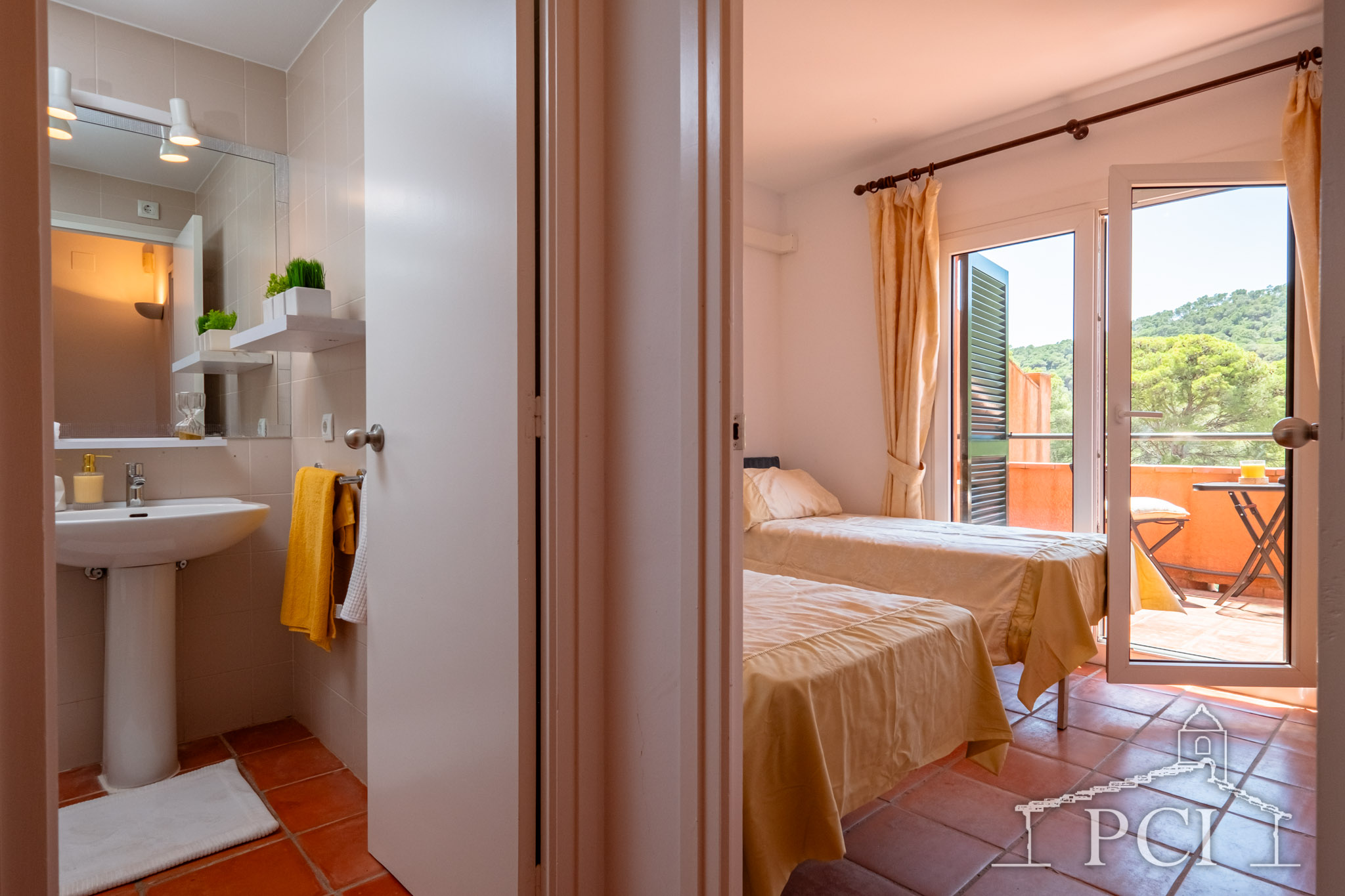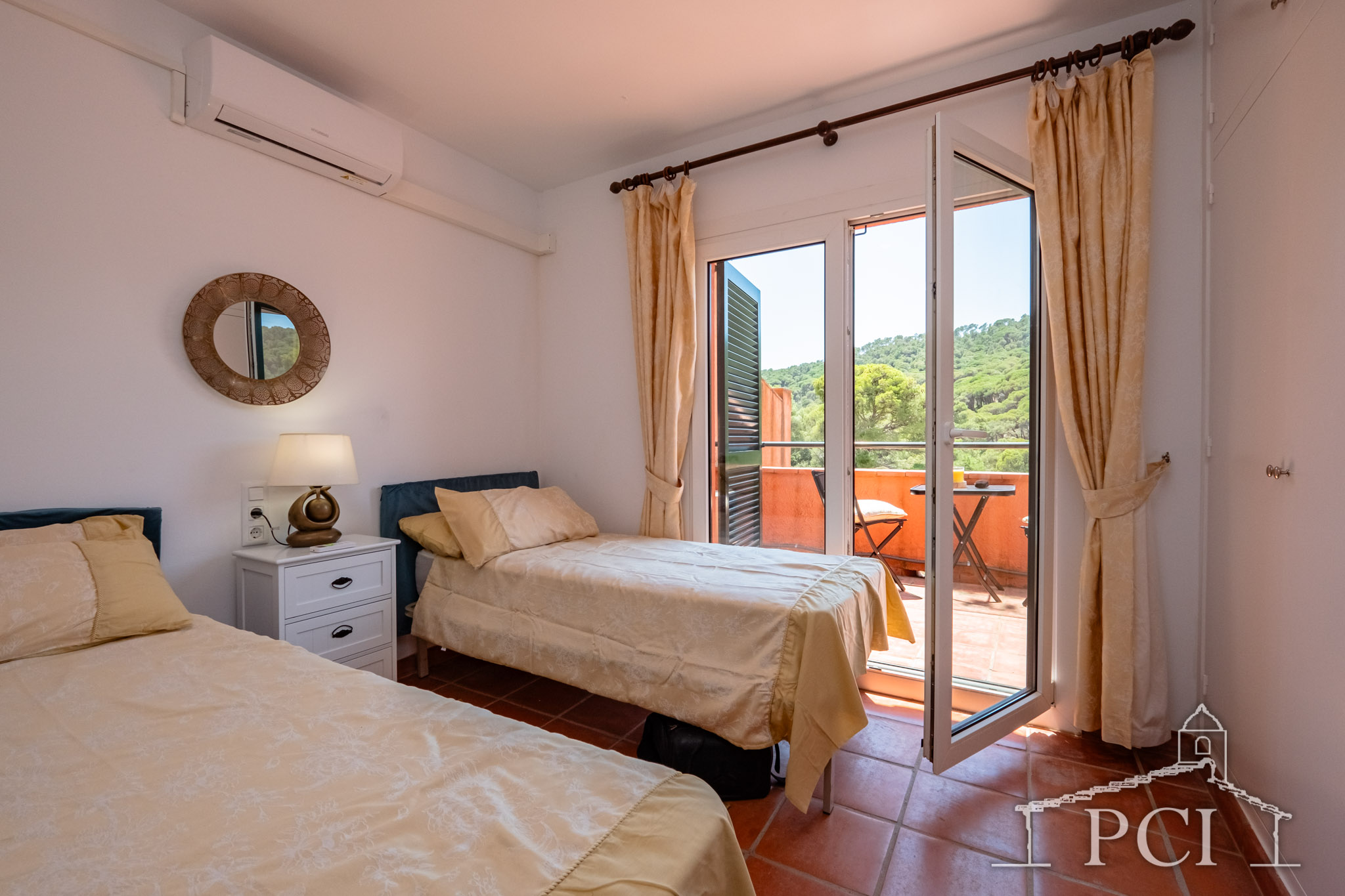 Entrance is via the community area which leads to a private garden and porch with sofas and chairs, the entrance is into the sitting room with fireplace, TV and fibre WiFi, fours stairs lead to the large kitchen and breakfast area, with microwave, dishwasher, washing machine, doors leading to west facing terrace with table and chairs. From the kitchen there are a few stairs leading to a bedroom with two single beds. Leading upstairs to the next level (above the sitting room) are 2 bedrooms, each with 2 single beds and a terrace (one with sea views and the other with forest views), 2 bathrooms, on the top level of the house is the “master” bedroom with a walk in shower, dressing area and a terrace with forest view, there is a fabulous sea from the bedroom window. Each bedroom has loads of wardrobe space.