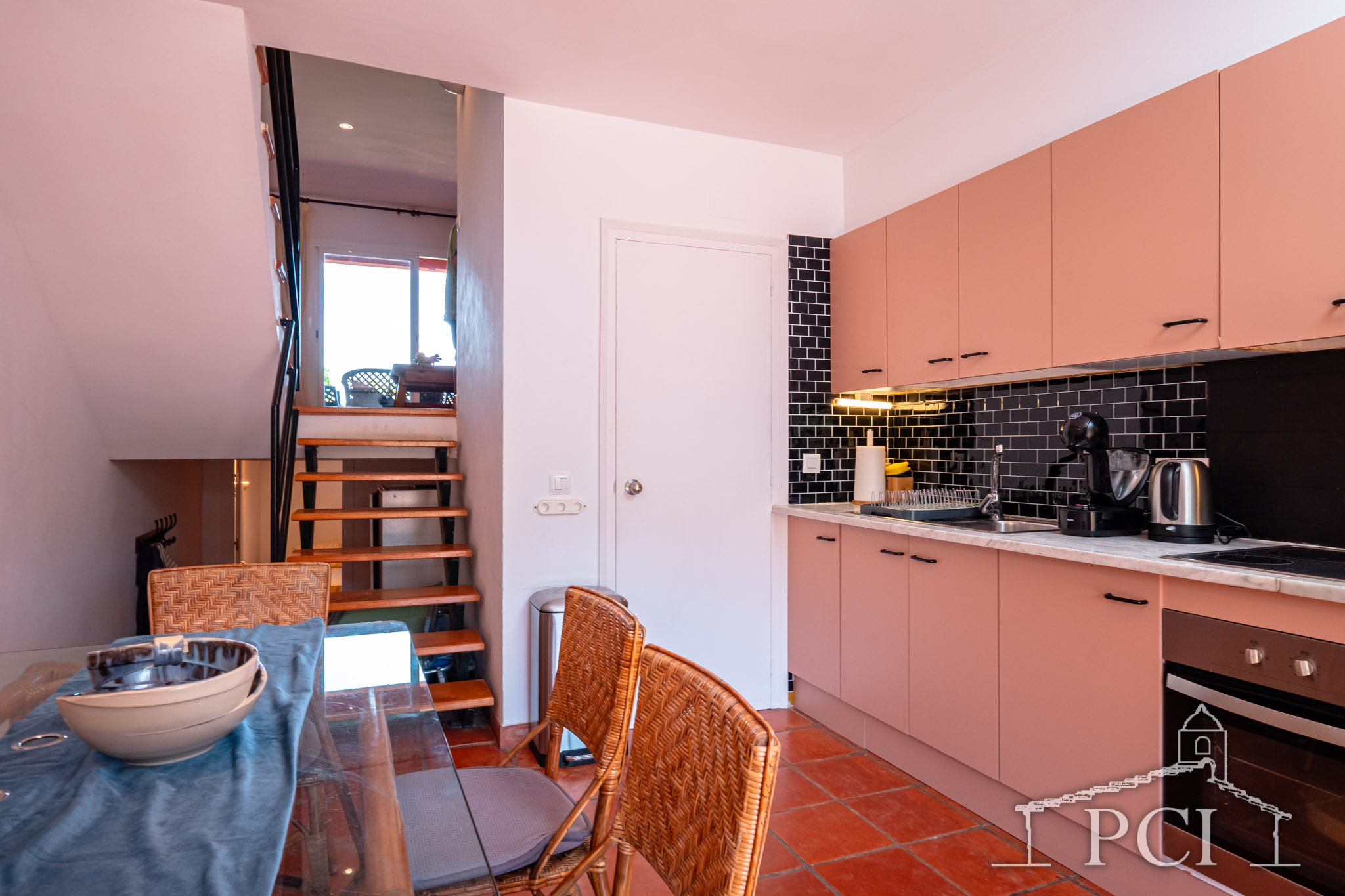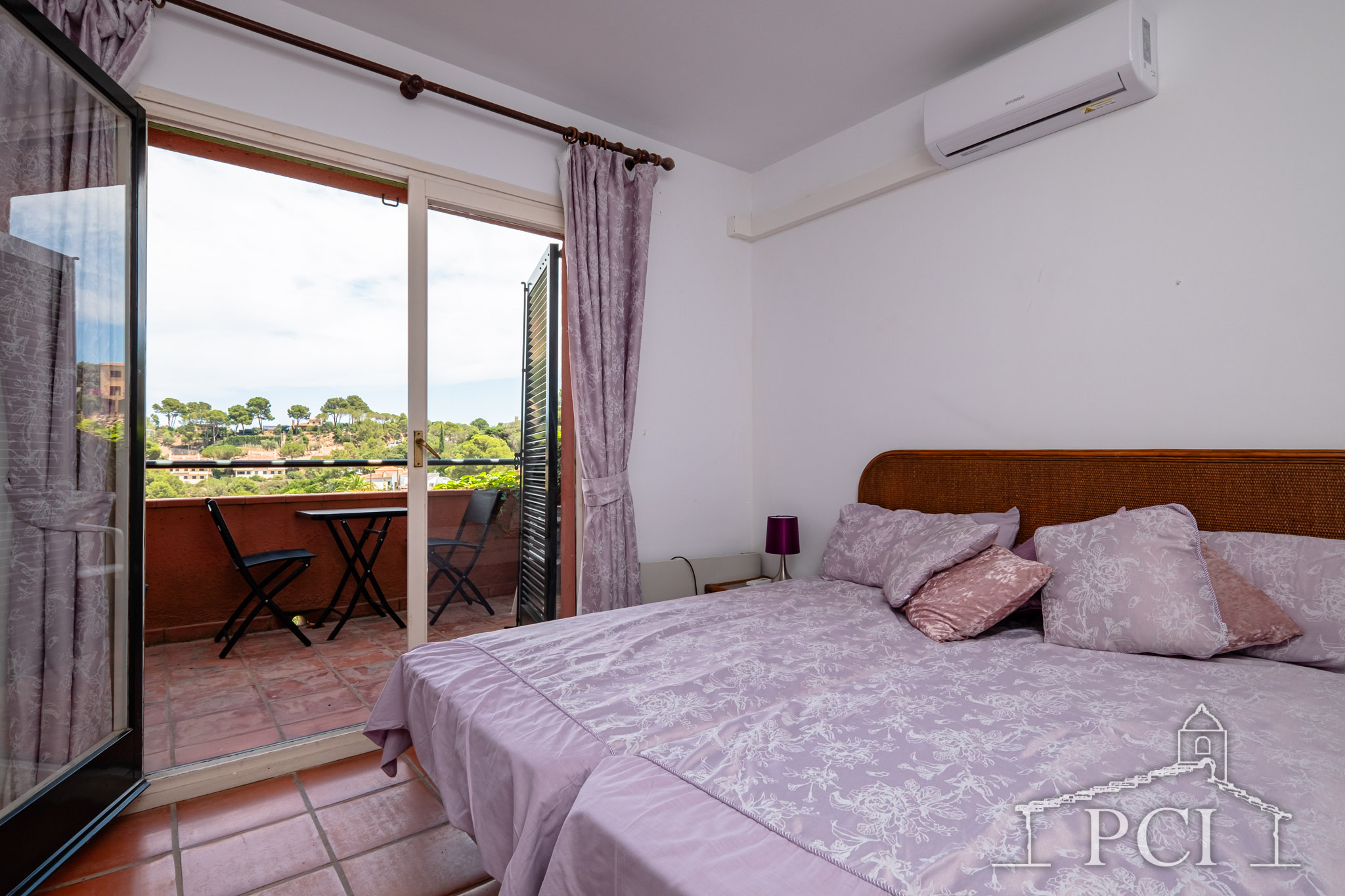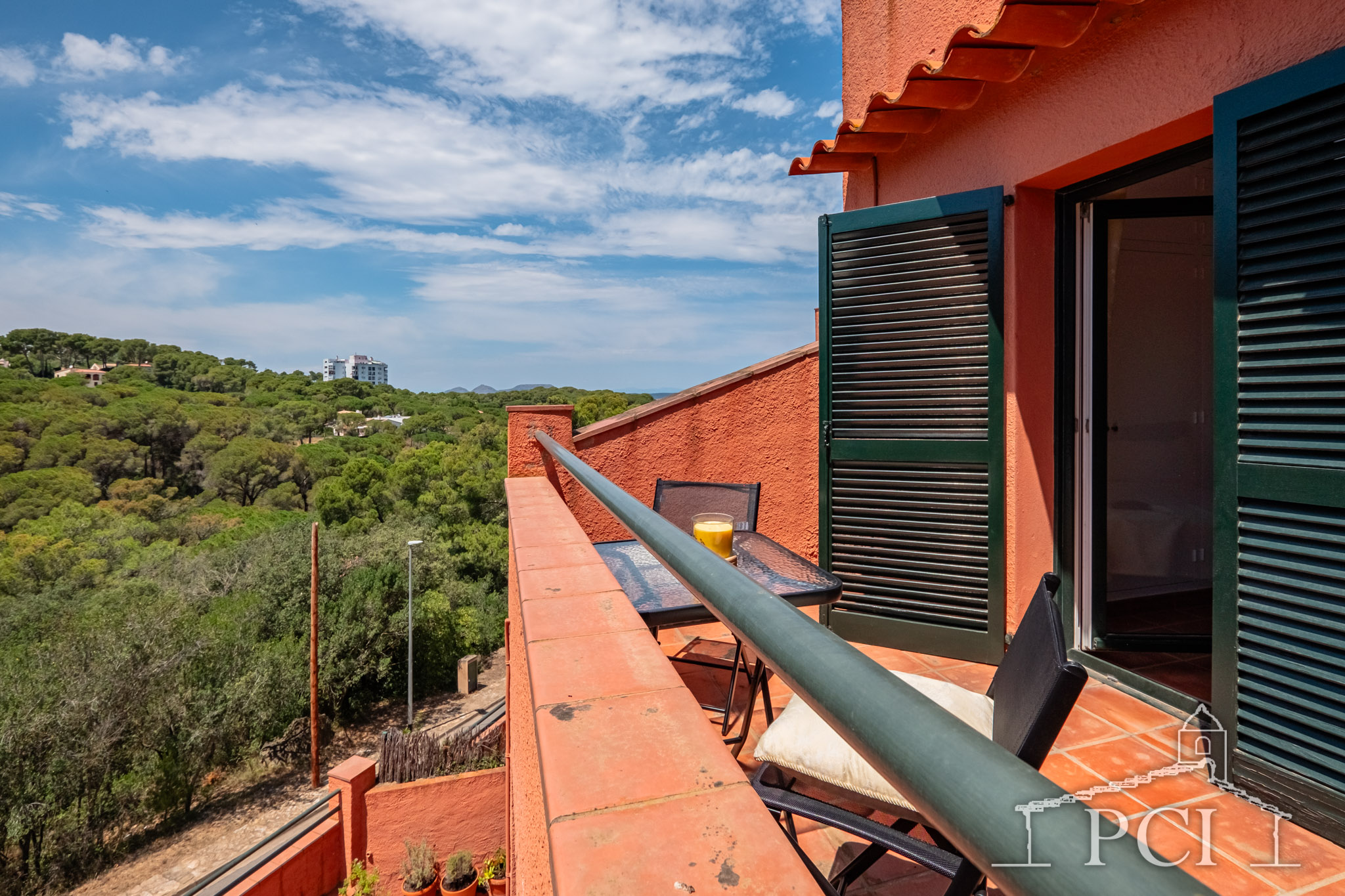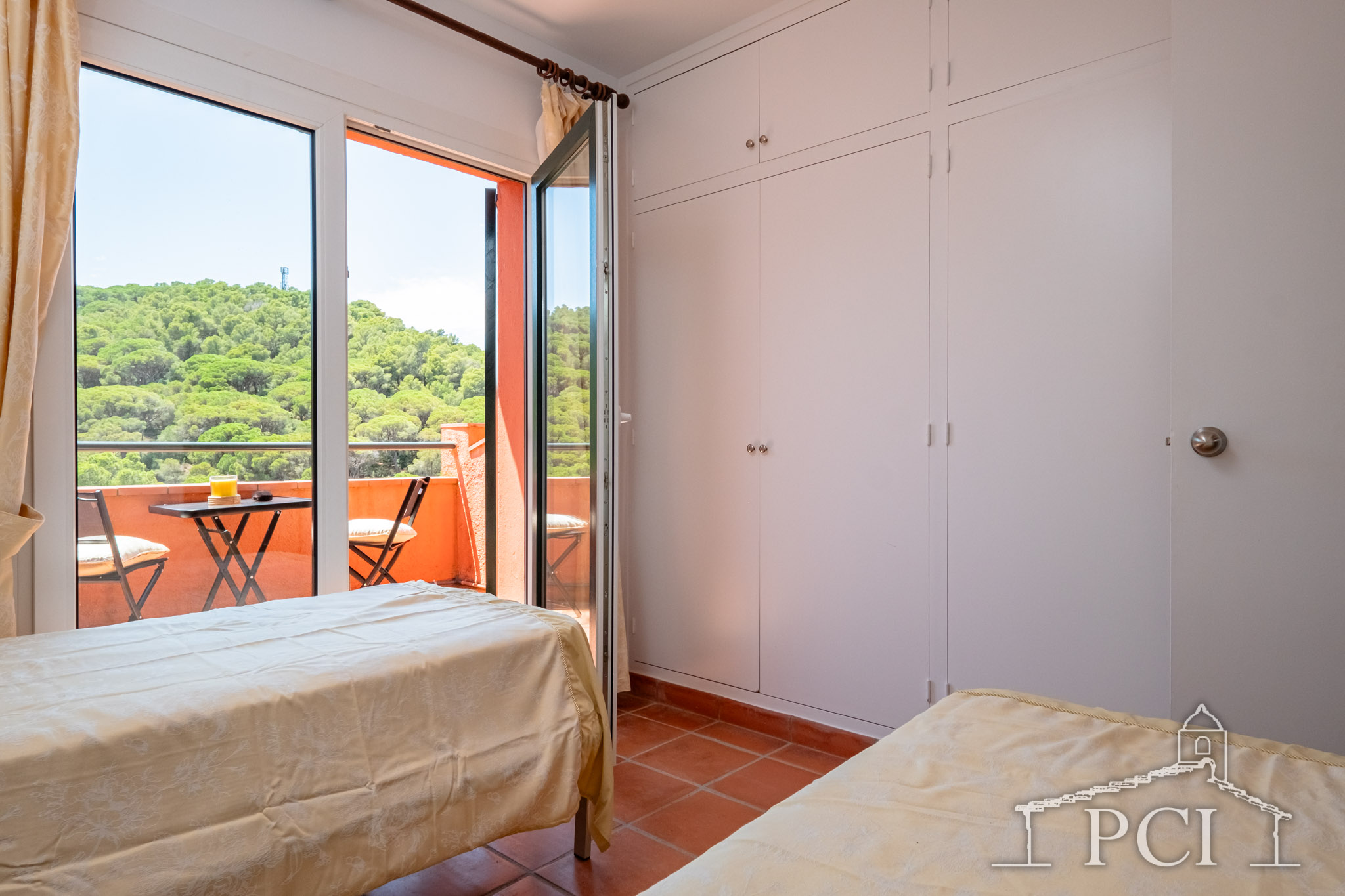 Entrance is via the community area which leads to a private garden and porch with sofas and chairs, the entrance is into the sitting room with fireplace, TV and fibre WiFi, fours stairs lead to the large kitchen and breakfast area, with microwave, dishwasher, washing machine, doors leading to west facing terrace with table and chairs. From the kitchen there are a few stairs leading to a bedroom with two single beds. Leading upstairs to the next level (above the sitting room) are 2 bedrooms, each with 2 single beds and a terrace (one with sea views and the other with forest views), 2 bathrooms, on the top level of the house is the “master” bedroom with a walk in shower, dressing area and a terrace with forest view, there is a fabulous sea from the bedroom window. Each bedroom has loads of wardrobe space.