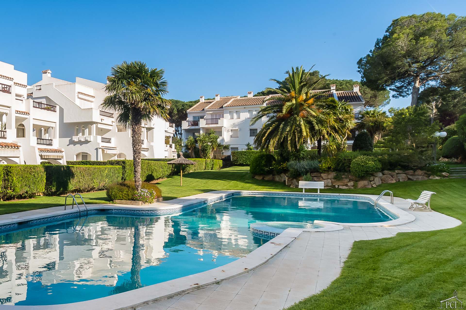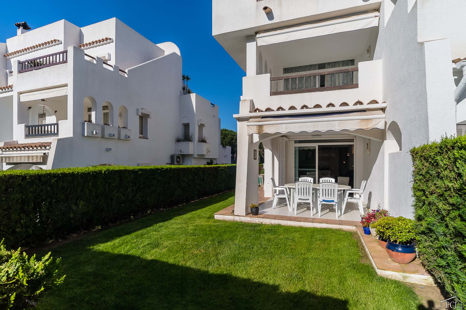 There is a good sized private garden which leads out to the communal garden and pool area.