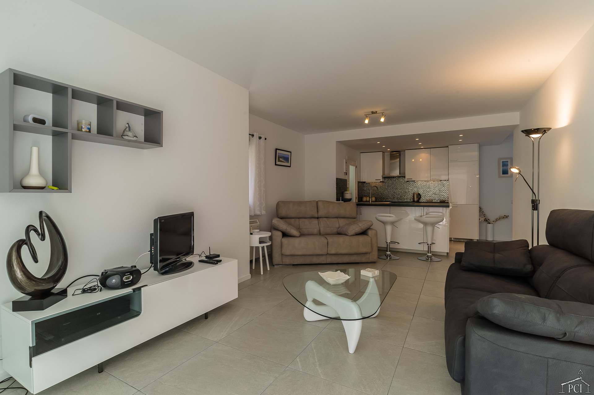 It has a recently refurbished and very well equipped open plan kitchen with washing machine, microwave, dishwasher, fridge/freezer, oven and hob. There is a small breakfast bar with two stalls. The sitting room is large and has a fresh bright out look leading to the covered terrace with table and chairs for 6, sun loungers.