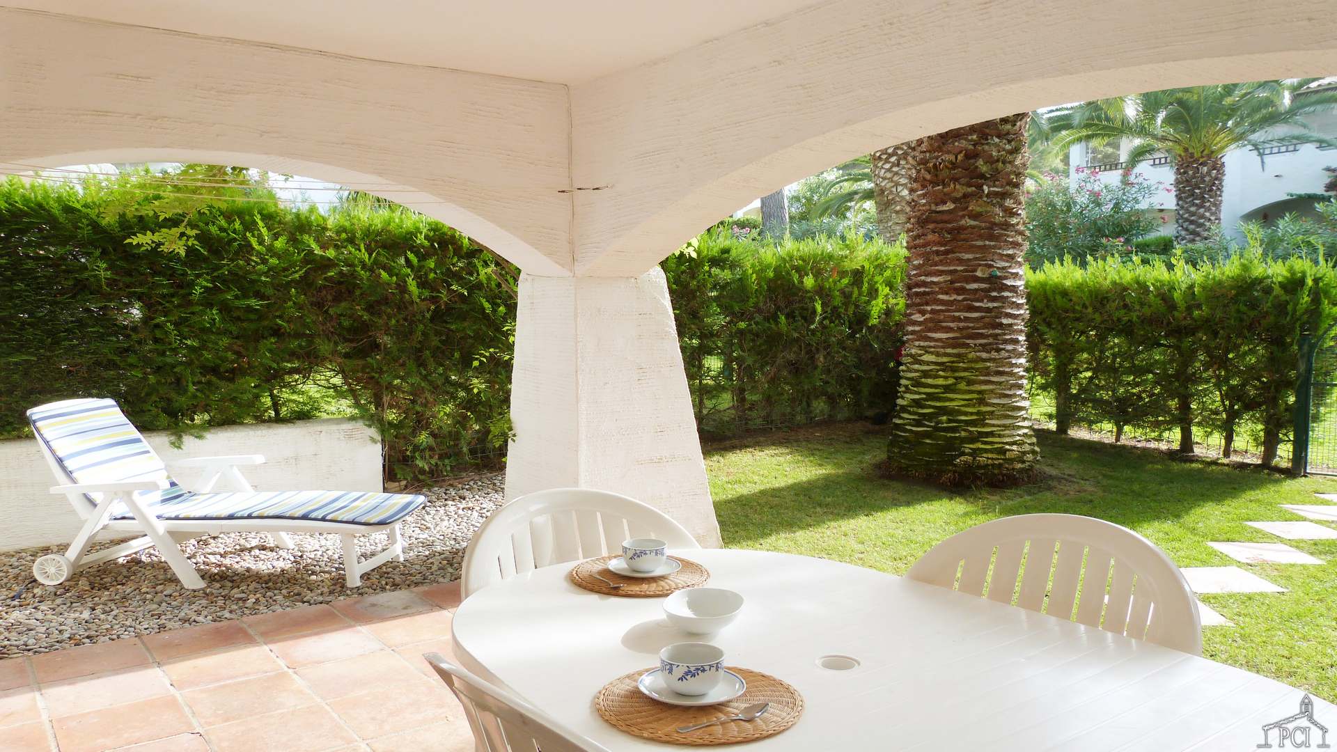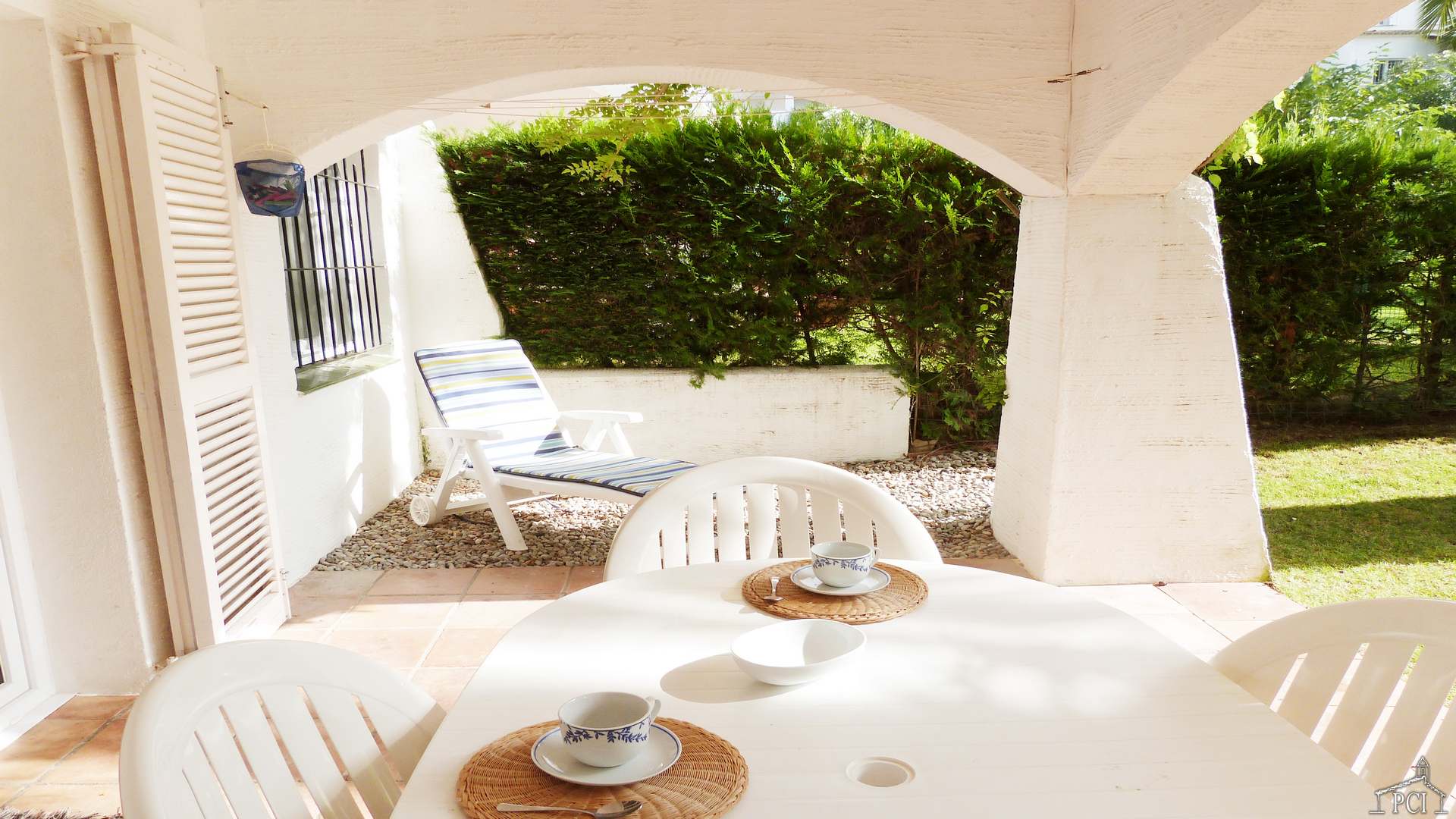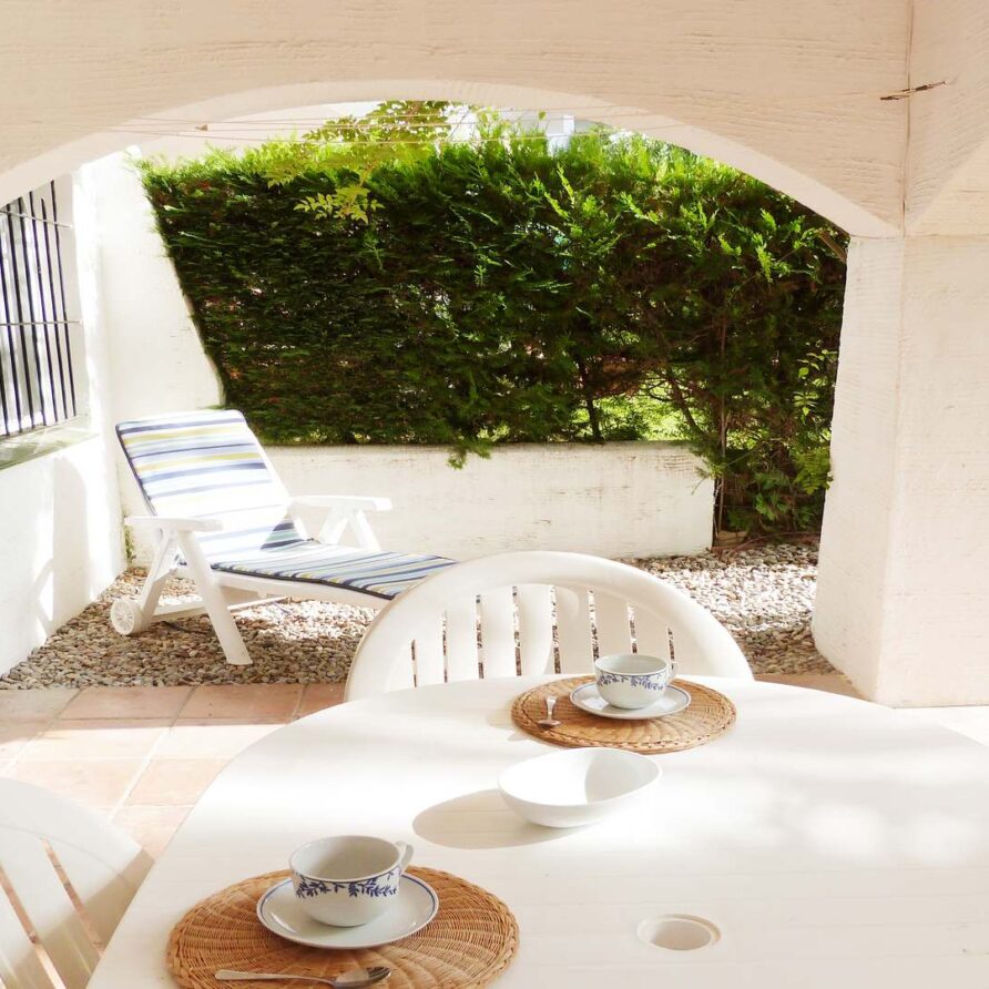 Covered terrace with beautiful private garden.