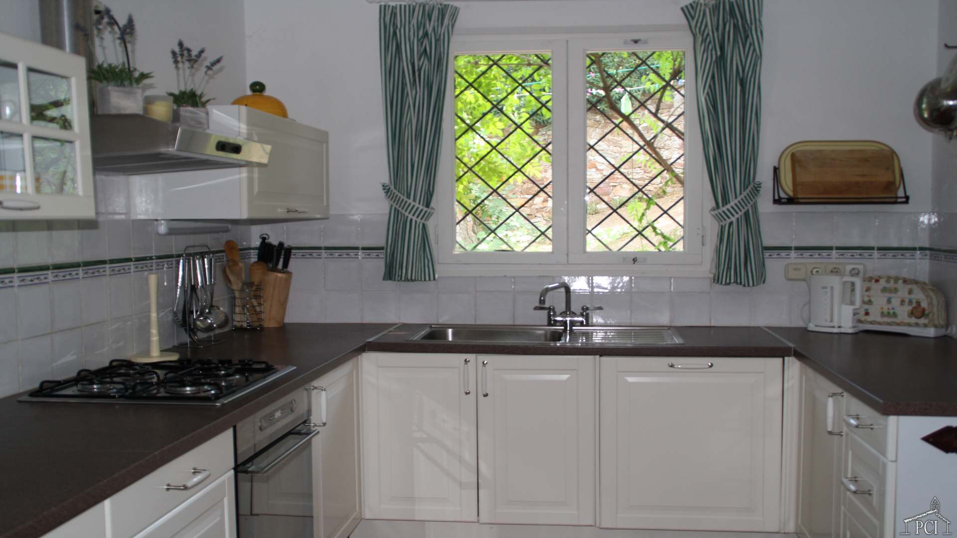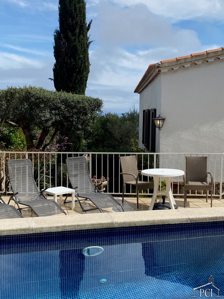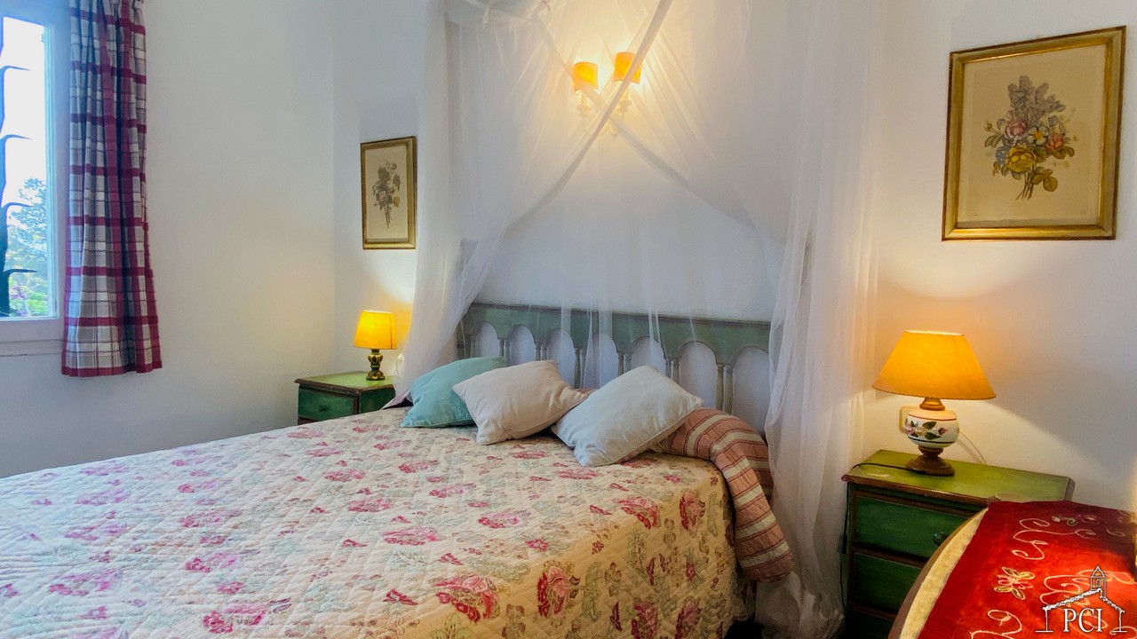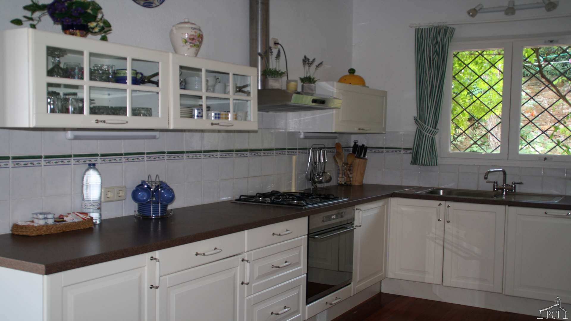 Distribuido en un solo nivel, un pequeño hall distribuidor se abre hacia el amplio salón-comedor (suelos de madera) con salida a dos terrazas, una de ellas con vista al mar y la otra con acceso a la piscina. La cocina americana y bien equipada: lavaplatos, cocina de gas, horno eléctrico, nevera combi, microondas. Consta de 1 habitación doble con baño/ducha y aire acondicionado, al lado de la cocina, el resto de habitaciones situadas después del salón-comedor: 1 suite con una cama doble (tamaño grande) con baño y salida a la terraza principal con vistas al mar, 1 habitación con cama doble, 1 habitación con 2 camas individuales, 1 lavabo de cortesía, 1 baño/ducha sin w.c.