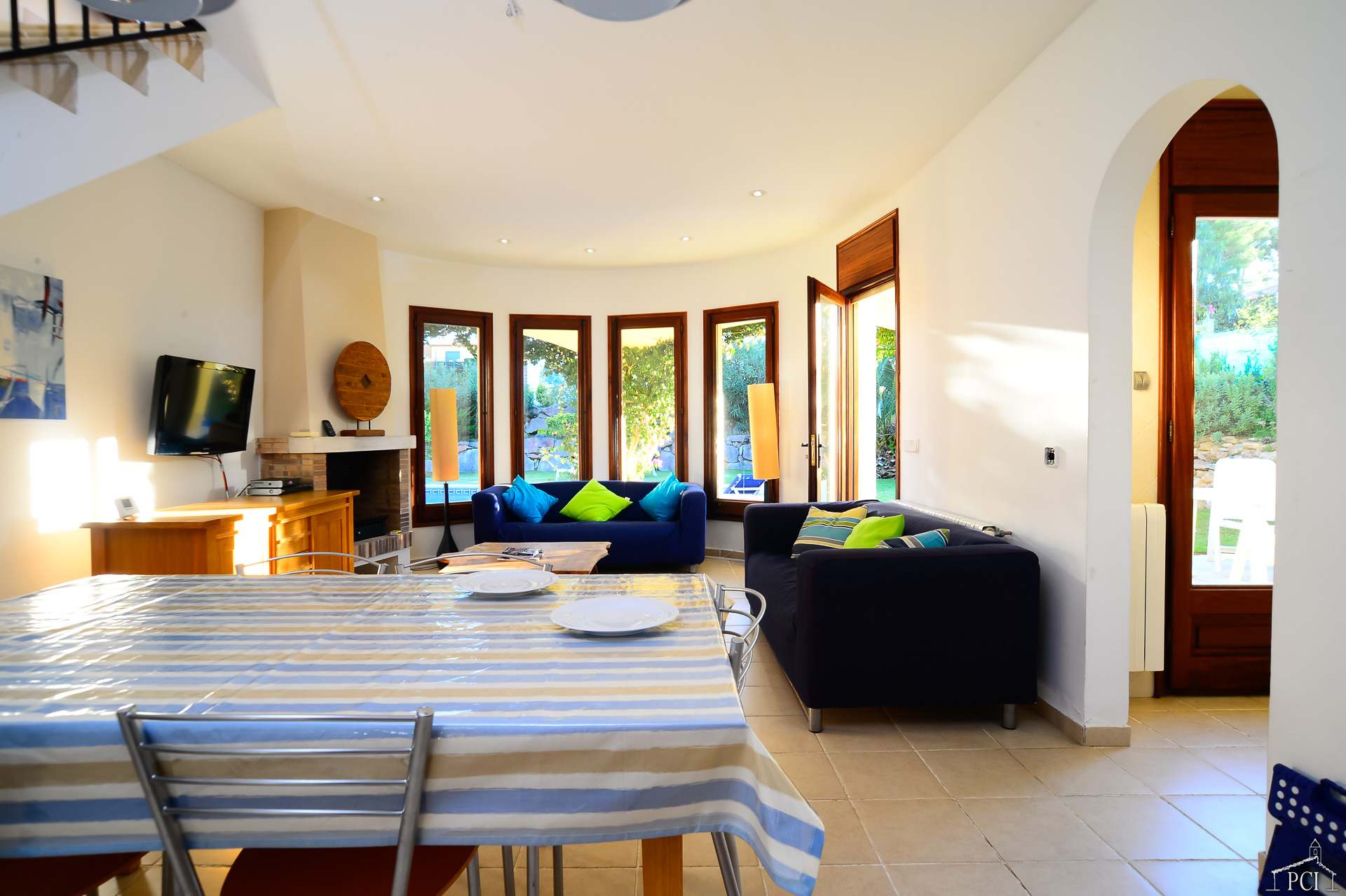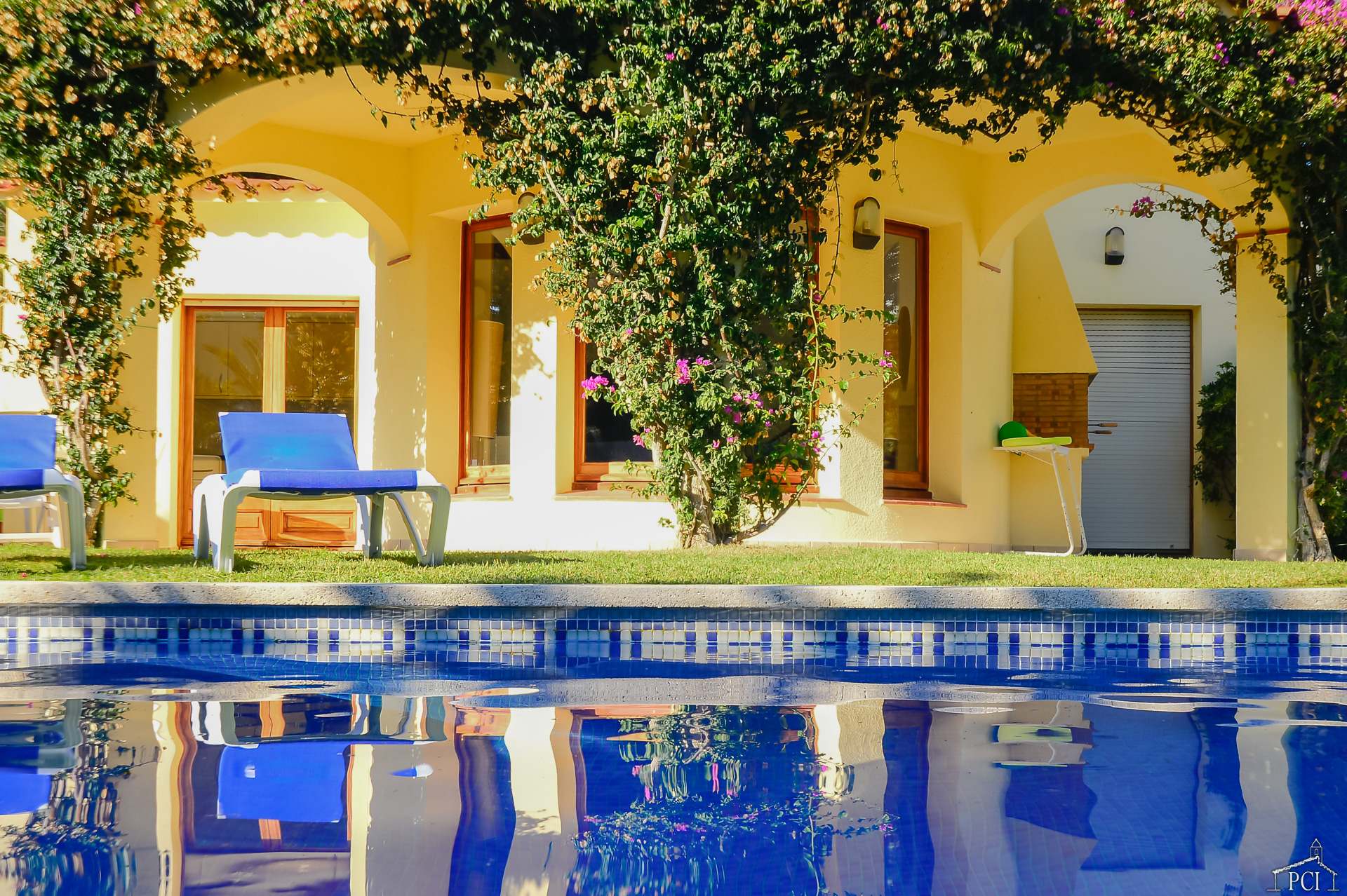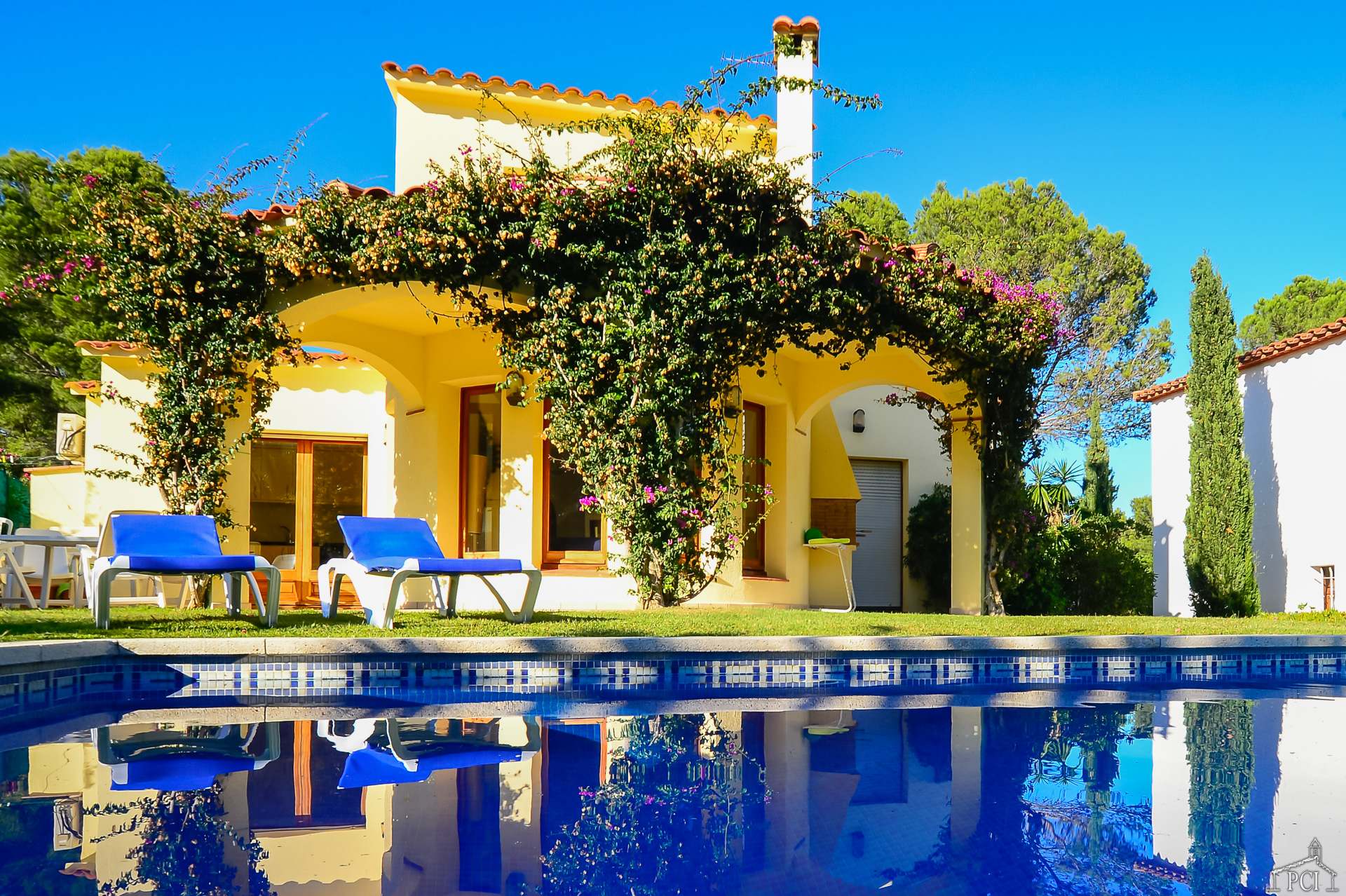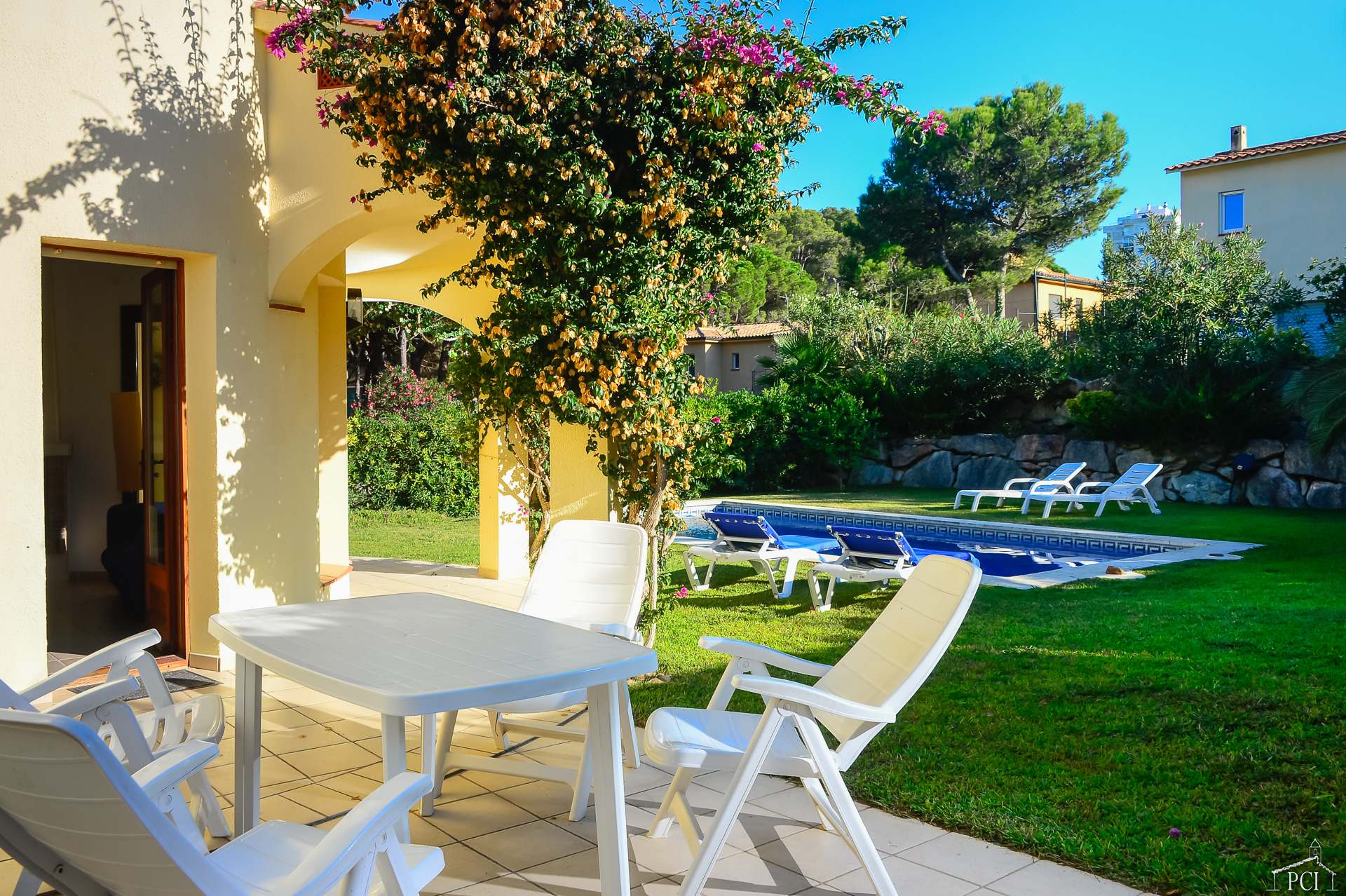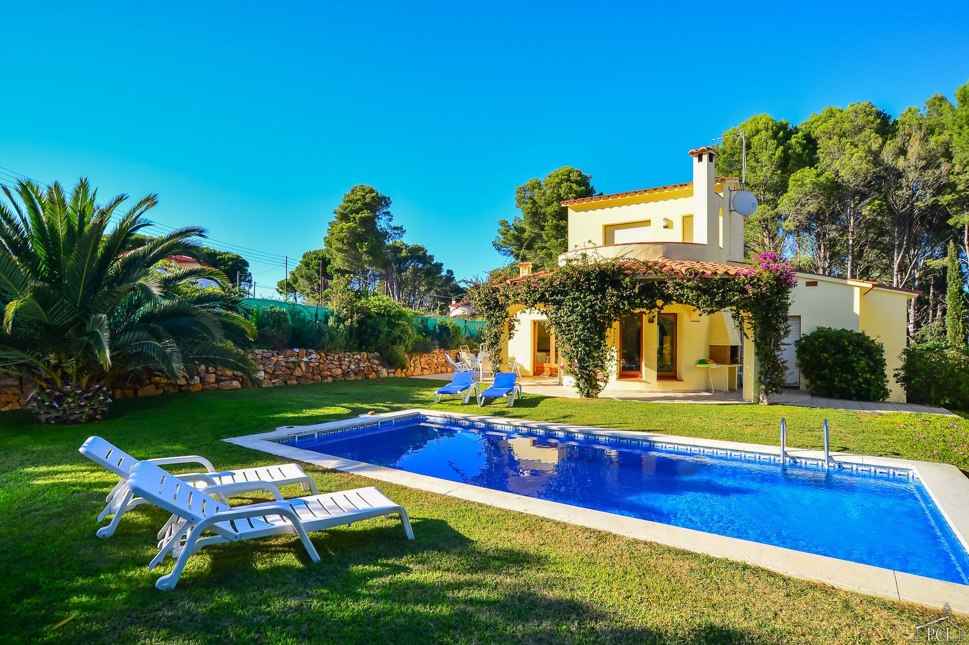 3 chambres – 2 avec lits jumeaux et 1 avec lit double, deux salles de bains – une en suite (sans toilettes), toilettes, cuisine entièrement équipée avec lave-vaisselle, four, plaque de cuisson, réfrigérateur et congélateur, grand salon et salle à manger menant au jardin privé entièrement clos et à la piscine.